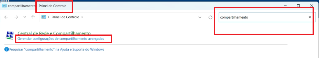 Acesse o Painel de Controle > Pesquise Compartilhamento > clique em Gerenciar configurações de compartilhamento avançado.