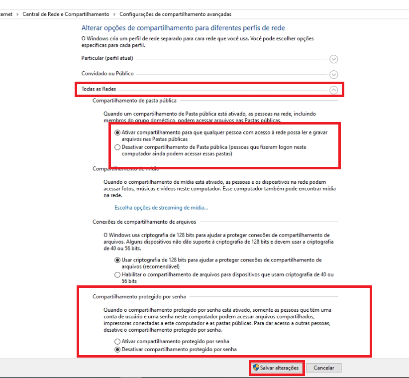 • Ative a opção: “Ativar compartilhamento para que qualquer pessoa com acesso à rede possa ler e gravar arquivos em pastas públicas”.