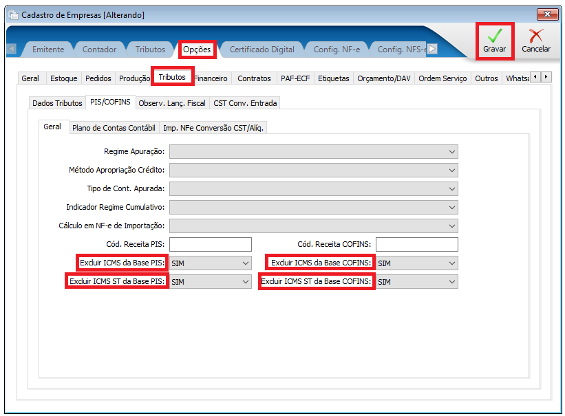 1. Na tela de opções, selecione a sub aba PIS/COFINS.